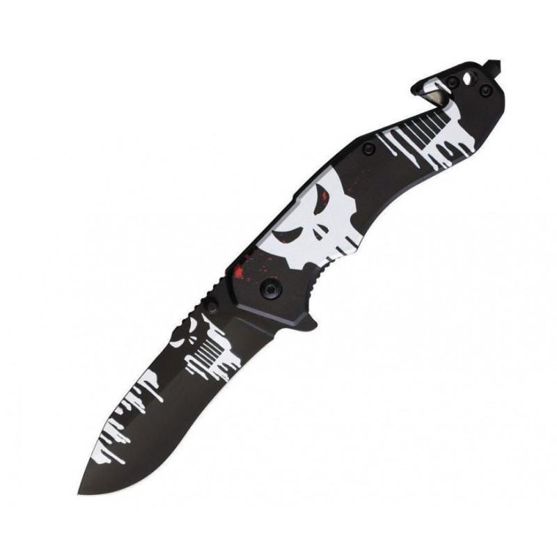 Ouverture assistée. 5" (12,7 cm) fermé. Lame en acier inoxydable de 3,5" (8,89 cm) au fini noir. Poignée en nylon noir. Coupe-ceinture/cordon. Briseur de verre. Trou de lanière. Soie allongée. Agrafe de poche. Goujon de pouce. Lame de crâne blanche et illustration de la poignée. En boîte.