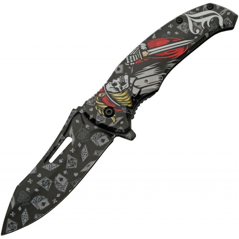 Ouverture assistée. 4,75" (12,07 cm) fermé. Lame en acier inoxydable de 3,75" (9,53 cm). Poignée ABS. Tirage au pouce. Soie allongée. Agrafe de poche. Lame joker tête de mort imprimée en 3D et illustration de la poignée. En boîte.
