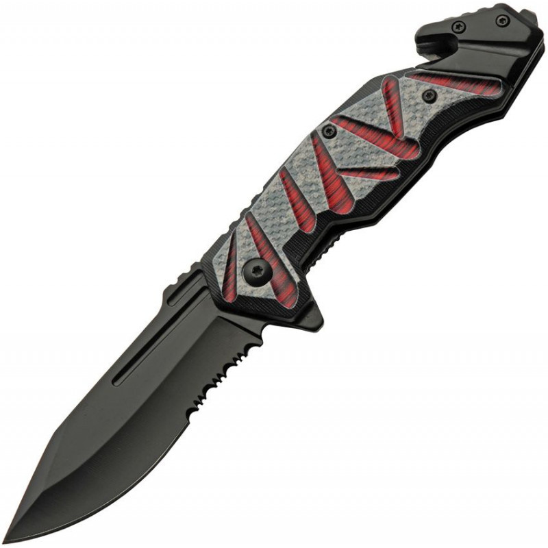 Ouverture assistée. 4,5" (11,43 cm) fermé. Lame en acier inoxydable partiellement dentelée de 3,5" (8,89 cm) au fini noir. Coupe-ceinture/cordon. Briseur de verre. Soie allongée. Agrafe de poche. Manche ABS noir, rouge et gris. En boîte.