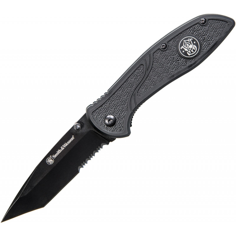 4.5" (11.43cm) fermé. 3.5" (8.89cm) enduit d'oxyde noir partiellement dentelé tanto lame en acier inoxydable 8Cr13MoV. Manche en aluminium caoutchouté noir. Goujon de pouce. Clip de poche. Palourde emballé.
