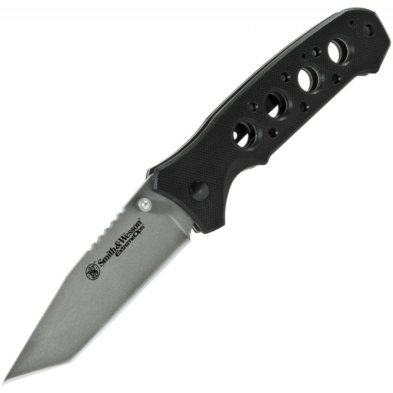 4 1/2" fermé. Lame tanto en acier inoxydable au fini gris de 3 3/8" avec deux clous pour le pouce. Poignées G-10 noires avec découpes de trous usinées. Trou de lanière. Clip de poche en acier inoxydable finition noire.