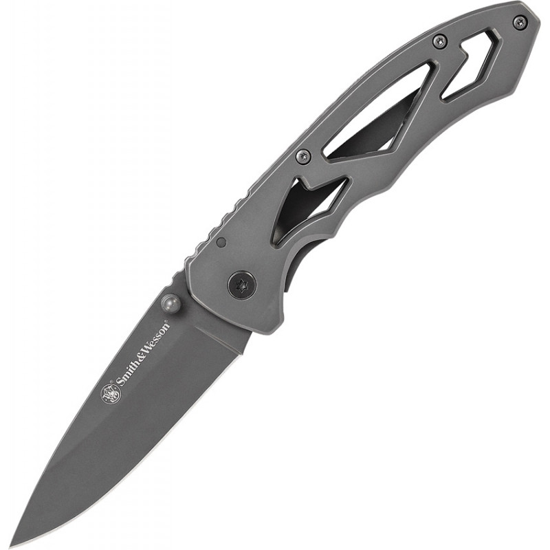 4 1/4" fermé. Lame de 3" en acier inoxydable à point de chute au fini titane avec deux clous pour le pouce. Poignées squelettées en aluminium finition titane. Clip de poche en acier inoxydable finition titane.