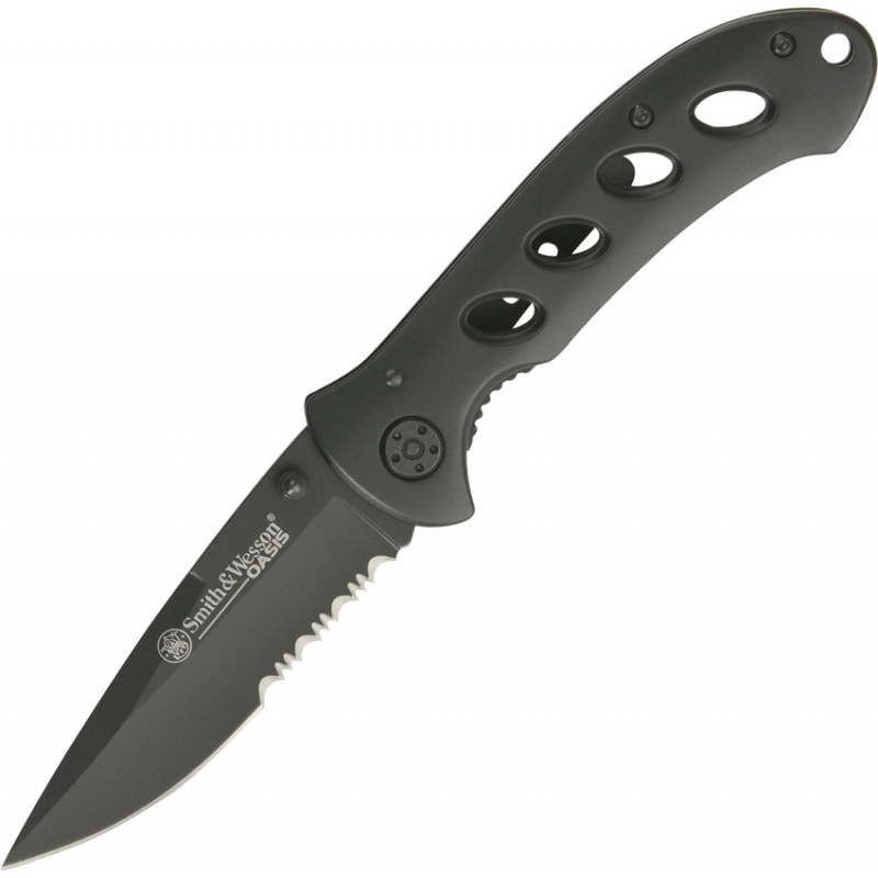 Lame et poignées revêtues de titane noir. Linerlock fermé de 4 1/4". Lame partiellement dentelée avec deux goujons pour le pouce. Poignées en acier inoxydable avec trou pour lanière. Clip de poche en acier inoxydable.