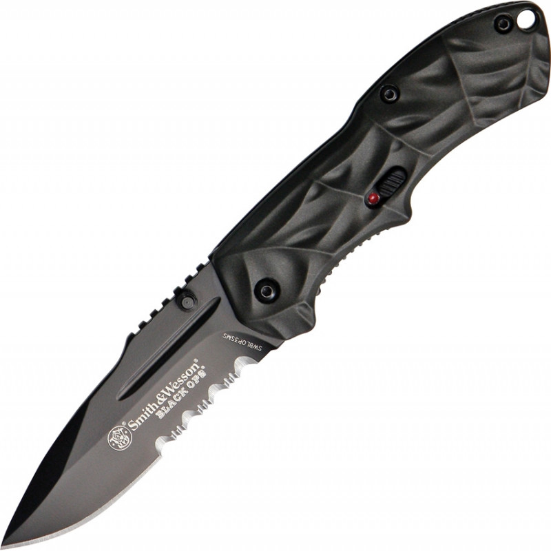 linerlock fermé de 3 3/8". Lame à point de chute en acier inoxydable 4034 partiellement dentelé à revêtement noir de 2 1/2" avec rainure de sang, goujons de pouce double et arête de pouce. Poignées en aluminium gris foncé. Mécanisme d'ouverture assistée MAGIC. Comprend une sécurité de verrouillage de la lame à verrouillage latéral. Clip de poche en acier inoxydable noir.