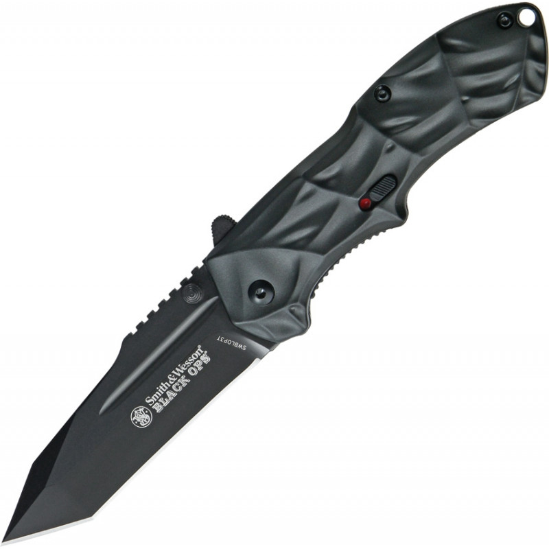 Poignées noires. Linerlock fermé de 4 3/8". Lame de tanto à vitesse assistée en acier 4034 finition noire de 3 1/2" avec deux goujons pour le pouce. Poignées en aluminium texturé. Clip de poche en acier inoxydable finition noire.