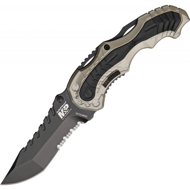 (Coutellerie Polyvalente, Assistée, Générationnelle, Innovante). 4 3/8" fermé. 3 3/8" fini noir partiellement dentelé Lame à ouverture assistée en acier inoxydable 4034 avec deux clous de pouce et soie allongée. Le verrou de sécurité dans la poignée verrouille la lame en position ouverte ou fermée. Poignées en aluminium aéronautique T6061 finition champagne avec garniture en caoutchouc noir. Clip de poche en acier inoxydable finition noire.