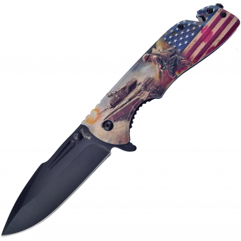 Ouverture assistée. 4,75" (12,07 cm) fermé. Lame de 3,75" (9,53 cm) en acier inoxydable au fini noir. Manche en aluminium avec illustration militaire. Tang allongé. Goujon de pouce. Clip de poche. Trou de lanière. Coupe-ceinture/cordon. Brise-vitre.Boîte.