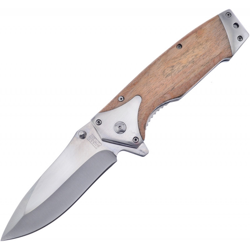 Couverts tranchants. Ouverture assistée. 5" (12,7 cm) fermé. Lame de 4" (10,16 cm) en acier inoxydable au fini satiné. Manche en bois d'olivier. Traversin(s) inoxydable(s). Tang allongé. Goujon de pouce. Trou de lanière. Clip de poche. Etui ceinture en nylon noir. En boîte.