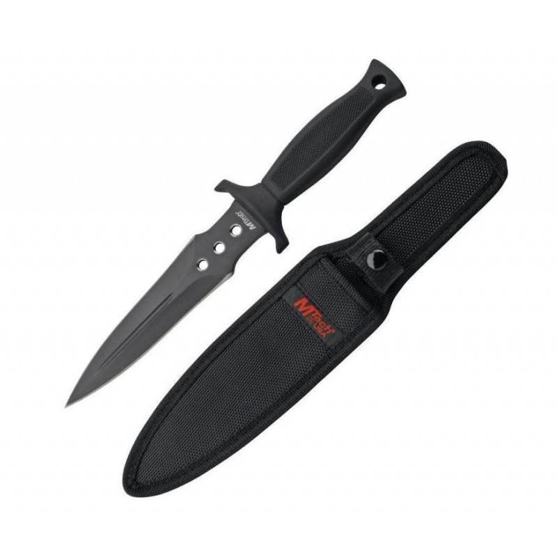 11,63 "hors tout. Lame de poignard en acier inoxydable 440 à double tranchant de 6,75". Manche caoutchouc quadrillé noir. Trou de lanière. Lame avec découpes de trous usinés et rainure plus pleine. Etui de ceinture en nylon noir.